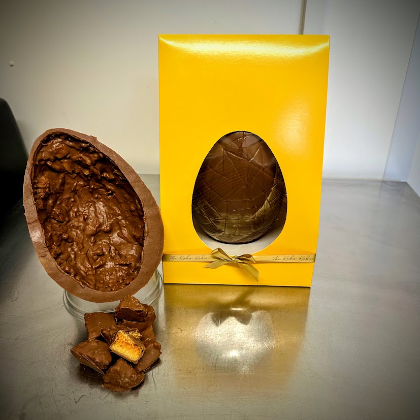 Indulge in this exquisite handmade milk chocolate Easter egg, featuring a delightful crunchy chocolate honeycomb lining that adds texture and sophistication. Inside, discover a filling of chocolate honeycomb pieces that deliver satisfying crunch with every bite. Perfect for Easter celebrations, this artisan creation combines premium milk chocolate with the irresistible appeal of honeycomb. A treat that brings together smooth chocolate and crispy honeycomb in one beautifully crafted egg.